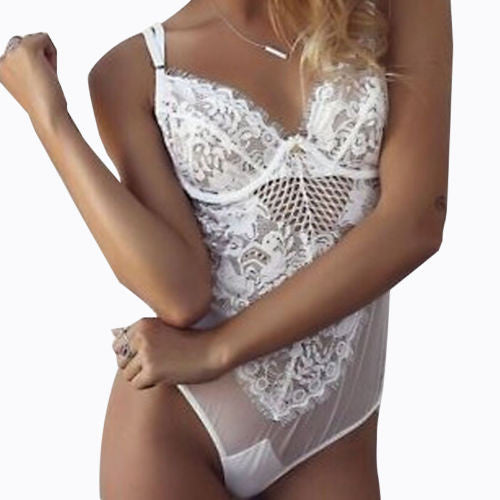 Sexy Women V Neck Full Lace Cross Back Bodysuit Bodycon Top Underwear Black/White