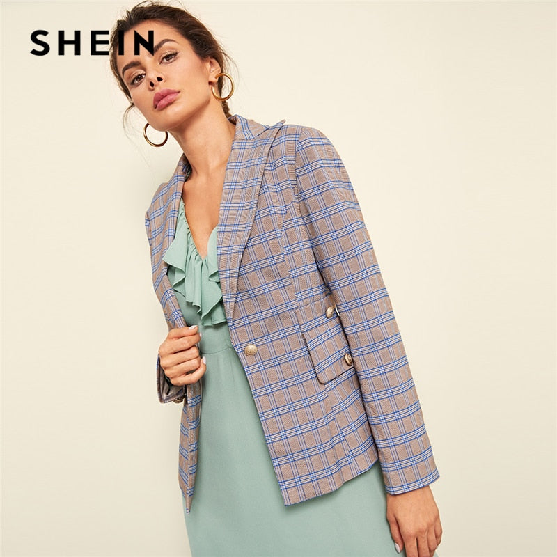 Multicolor Office Lady Elegant Single Button Breasted Plaid Highstreet Blazer
