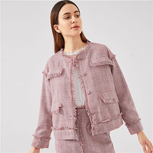 SHEIN Pink Office Lady Frayed Edge Trim Button Up Plaid Single Breasted Highstreet Jacket