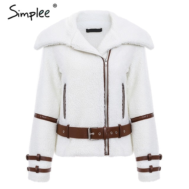 Turndown collar zipper winter women coat parka Sash shaggy white thick